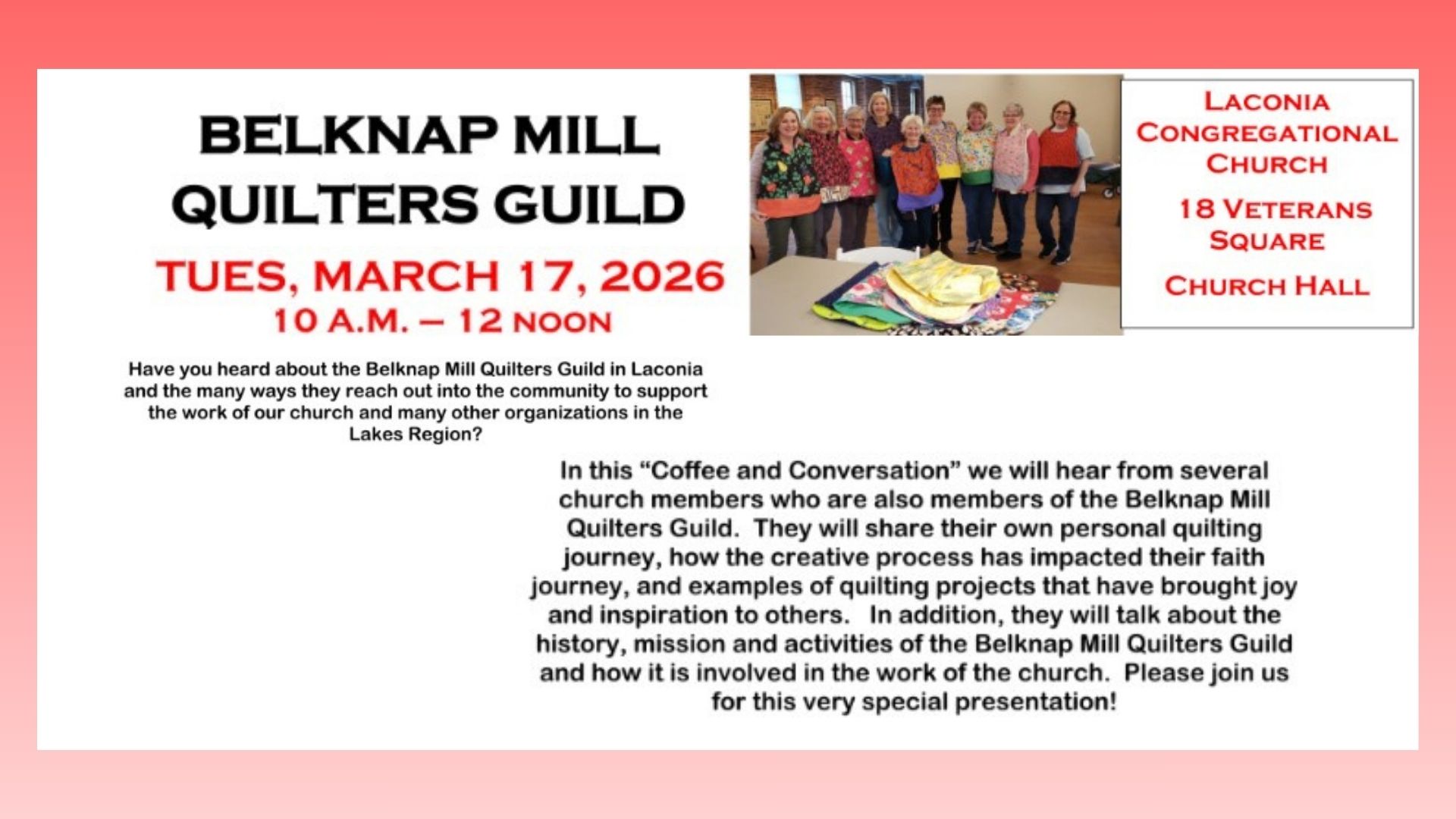 March Tuesday 17 Coffee and Conversation 10:00 am - 12:00 pm Save the Date SHARE ON Twitter Facebook Buffer LinkedIn Pin It